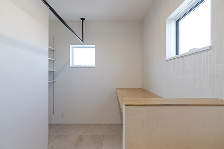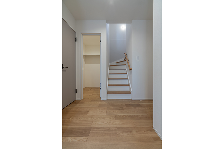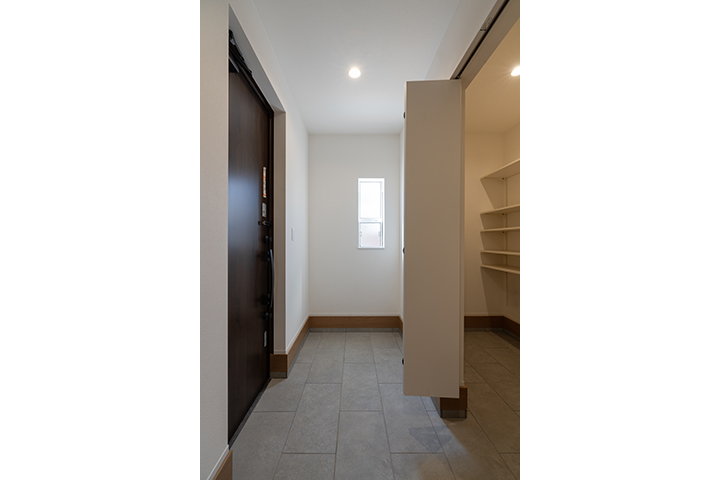 日差しや雨などを防ぐ玄関ポーチは、悪天候時でも快適な出入りや荷物の搬入が可能。ベビーカー等も収納できる大容量のシューズクロークでごちゃつきがちな玄関まわりもすっきり。毎日の洗濯を効率的に行えるランドリールームは、天気や時間を気にせず洗濯が可能。シーズンオフの荷物などの収納や、書斎や趣味のスペースとしても使える便利な納戸も。