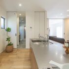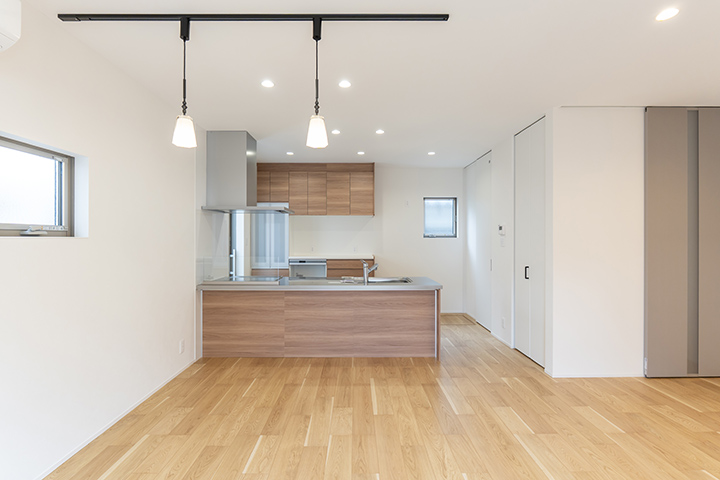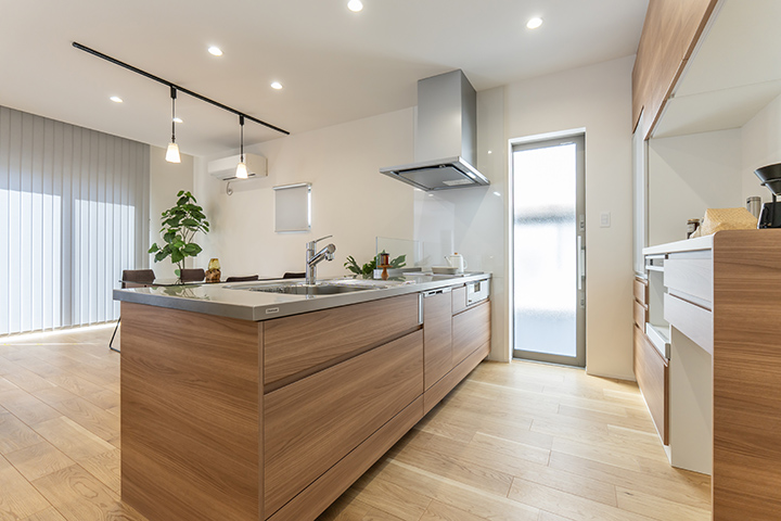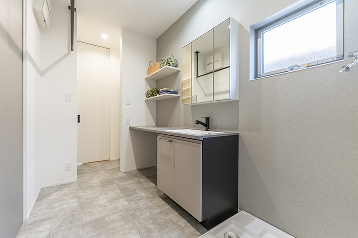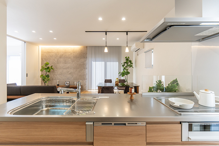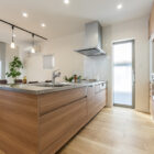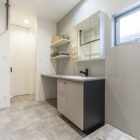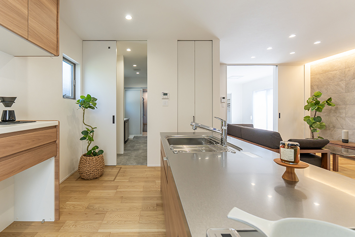 キッチンカウンターはお施主様の身長に合わせてオーダー。洗面所にはウォークインクローゼットを併設し、回遊動線で使いやすい間取りに。快適性と使いやすさにこだわりました。