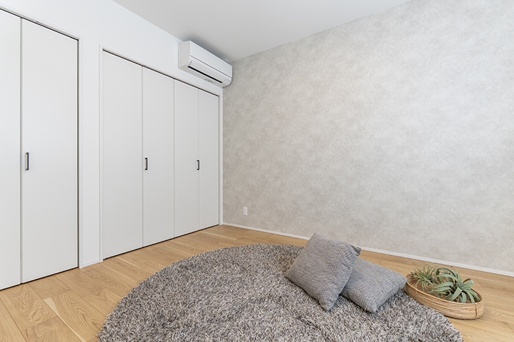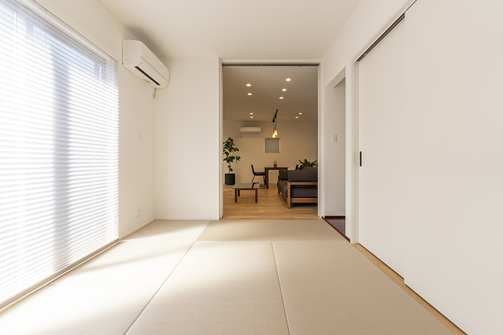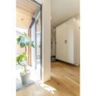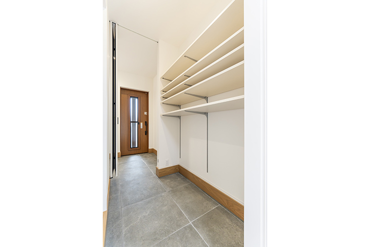 玄関アプローチから玄関まで段差ゼロにするためスロープを設置。将来的に車椅子で玄関から主寝室・トイレまでスムーズに移動できる動線を確保。